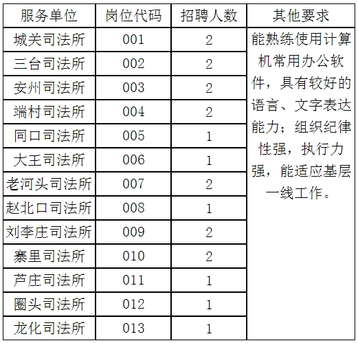 為進(jìn)一步夯實基層司法行政工作力量,著力提升司法所服務(wù)基層治理現(xiàn)代化能力和水平,切實做好我縣司法協(xié)理員試點工作,經(jīng)縣委、縣政府批準(zhǔn),決定面向社會公開招聘司法協(xié)理員20名,現(xiàn)將有關(guān)事項公告如下: