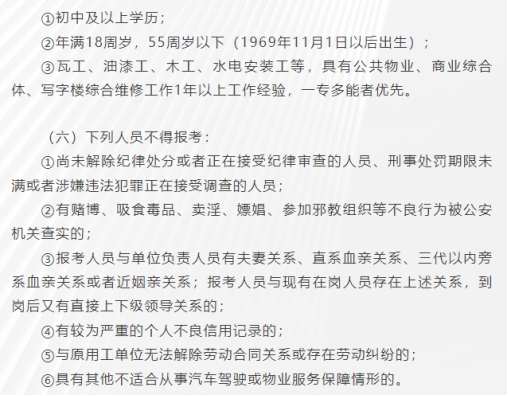 ②年滿18周歲,男性在40周歲以下(1984年10月24日以后出生),女性在35周歲以下(1989年10月24日以后出生);中共黨員、有機關事業單位或部隊服役經歷的,男性年齡放寬至45周歲(1979年10月24日以后出生),女性年齡放寬至40周歲以下(1984年10月24日以后出生);持有A1駕駛證的,男性年齡放寬至50周歲(1974年10月24日以后出生),女性年齡放寬至45周歲以下(1979年10月24日以后出生);