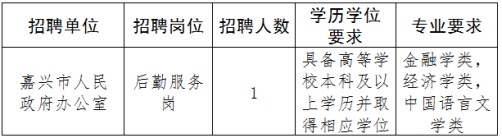 因工作需要,嘉興市人民政府辦公室決定面向社會公開招聘崗位合同工(勞務派遣制)1名,具體公告如下: