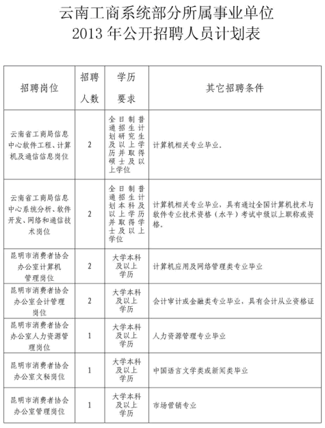 詳見《云南工商系統部分所屬事業單位2013年公開招聘人員計劃表》