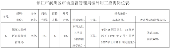 (五)招聘崗位、人數和所要求的學歷、專業等資格條件詳見《鎮江市潤州區市場監督管理局編外用工招聘崗位表》(附件1)。