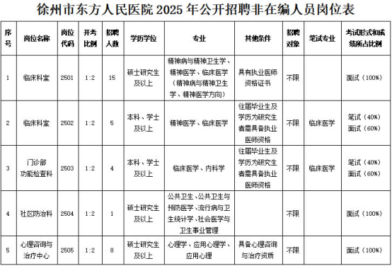 (六)具備《徐州市東方人民醫院2025年公開招聘非在編人員崗位表》中崗位要求的學歷學位條件及資格條件。其中,“專業”條件由招聘單位按《江蘇省2025年度考試錄用公務員專業參考目錄》設置并審核。專業條件中還包括未列入專業參考目錄,但有院校開設,并且有單位需要的專業。